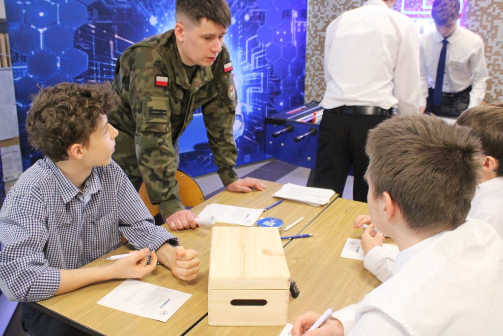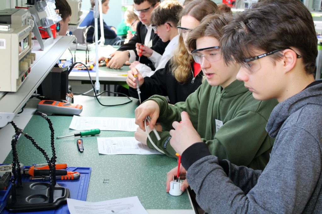 W zadaniu pierwszym, w pracowni elektronicznej, uczestnicy wykonywali montaż precyzyjny przedłużacza sieciowego pojedynczego, w oparciu o niezbędne narzędzia, urządzenia i osprzęt elektryczny. Jako asystenci, pomagali uczestnikom, uczniowie z klasy 2ad, którzy zostali przeszkoleni jako instruktorzy stanowisk.